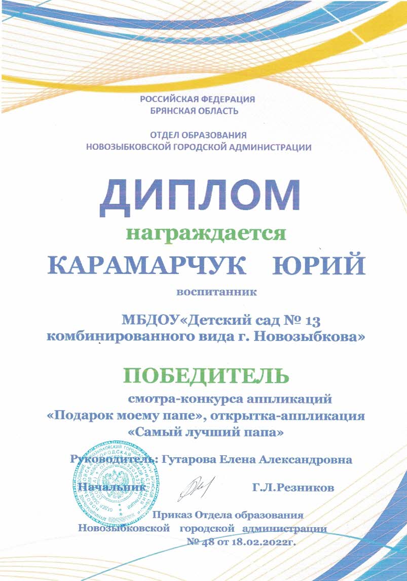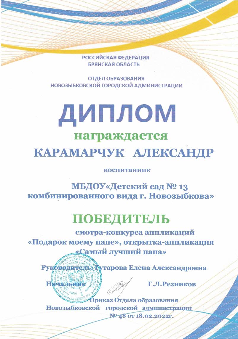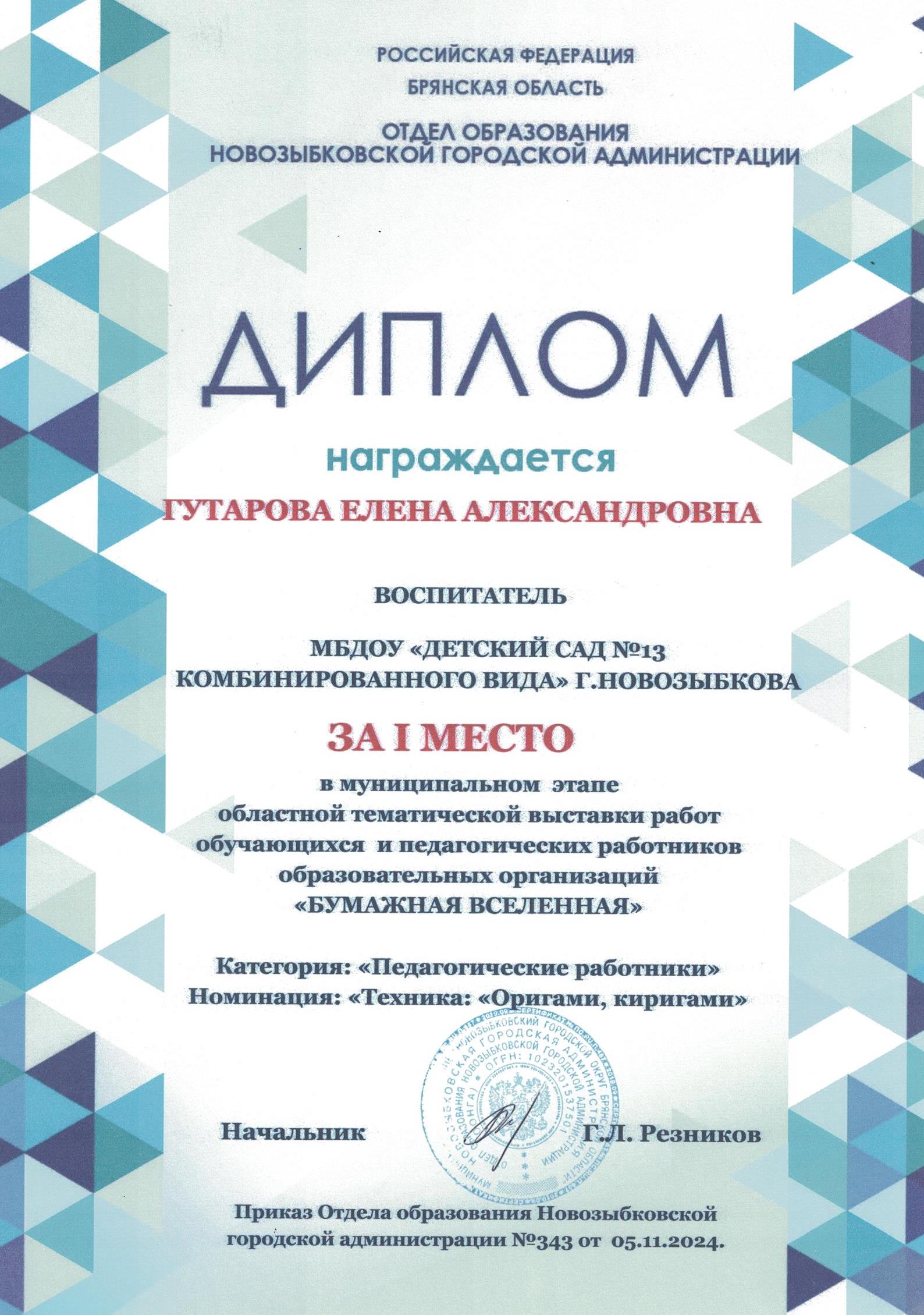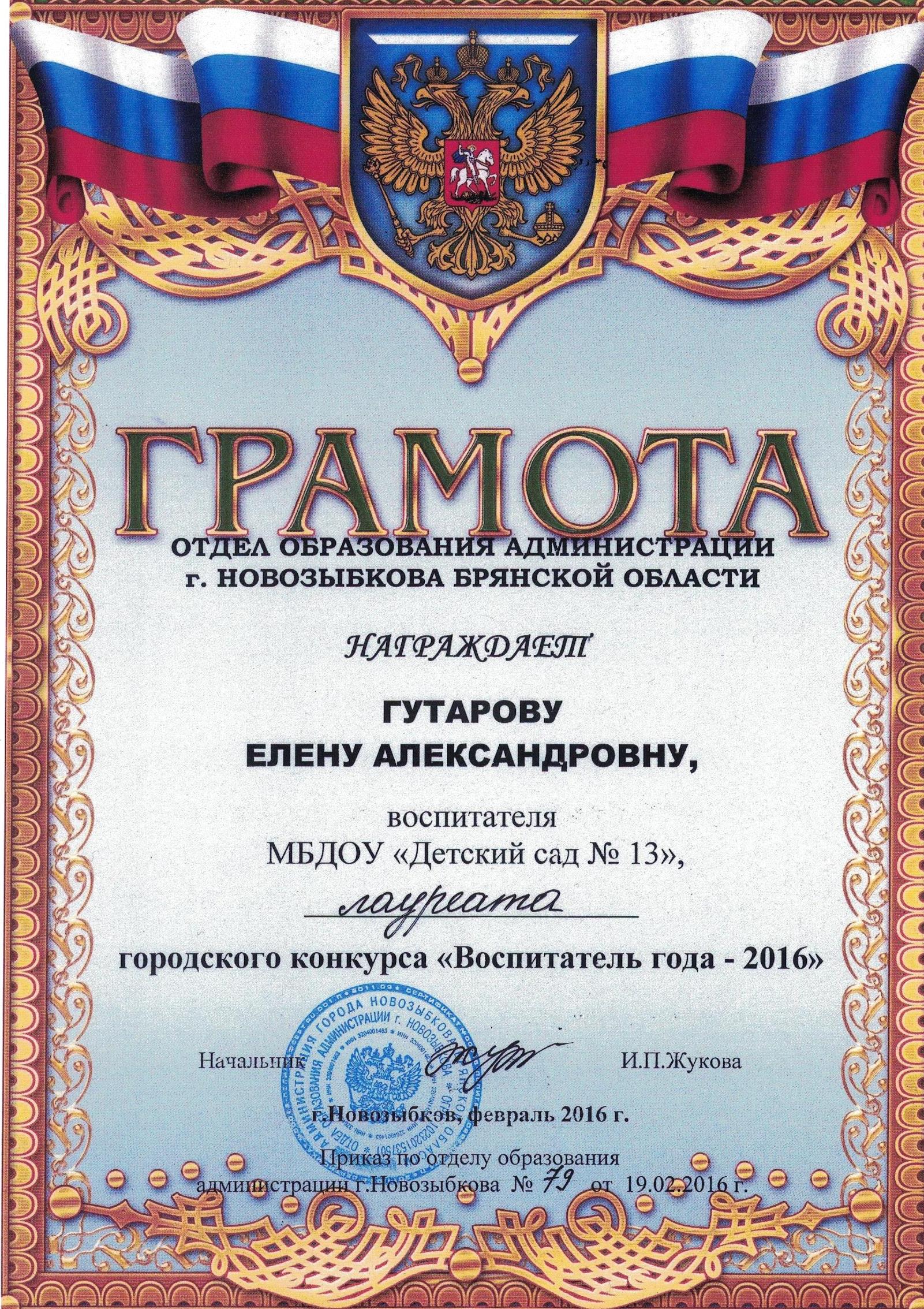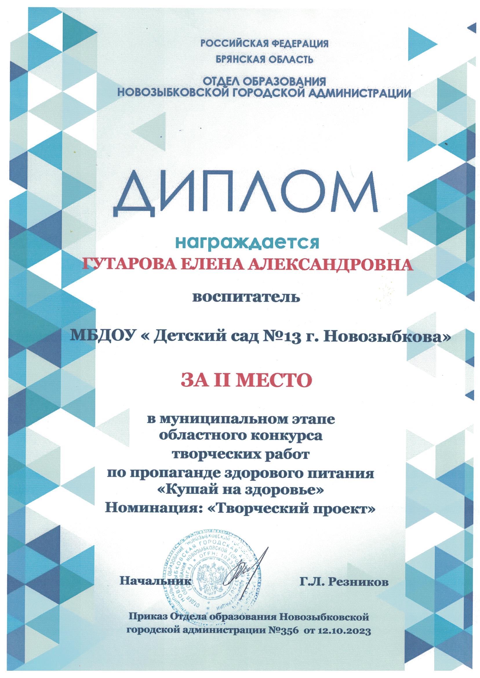 ФИО: Гутарова Елена Александровна Место работы: Муниципальное бюджетное дошкольное образовательное учреждение «Детский сад №13 комбинированного вида» г. Новозыбкова Должность: воспитатель Категория: высшая Общий трудовой и педагогический стаж: 21 год Образование: высшее Название, год окончания учреждения профессионального образования: Брянский государственный университет имени академика И. Г. Петровского, филиал Брянского государственного университета имени академика И. Г. Петровского в г. Новозыбкове, 2003 год Факультет: физико – математический Специальность, квалификация по диплому: математика, учитель математики и физики Диплом о профессиональной переподготовке: дошкольное образование 13.04.2018 год Курсы повышения квалификации: 08.02.2024 – 21.02.2024 Государственное автономное учреждение дополнительного профессионального образования Брянской области «Региональный учебный центр» по программе: «Реализация федеральной образовательной программы дошкольного образования в соответствии с ФГОС ДО».