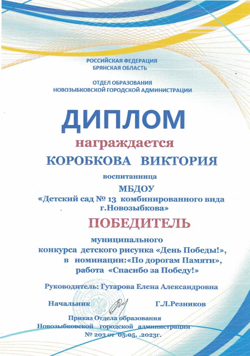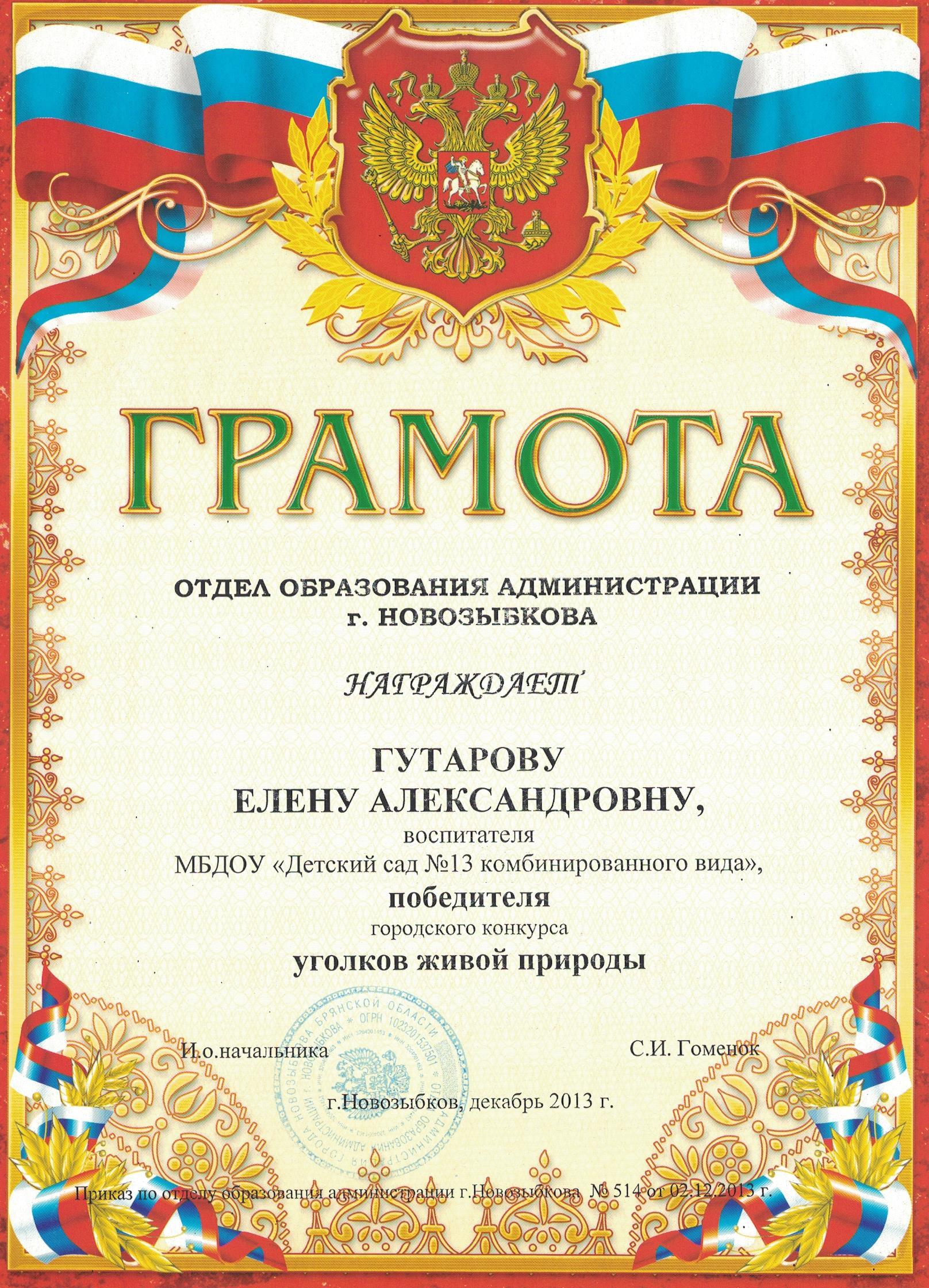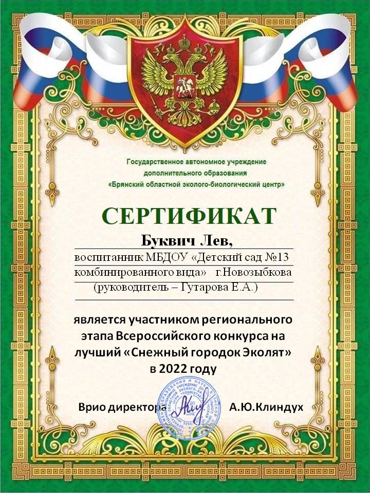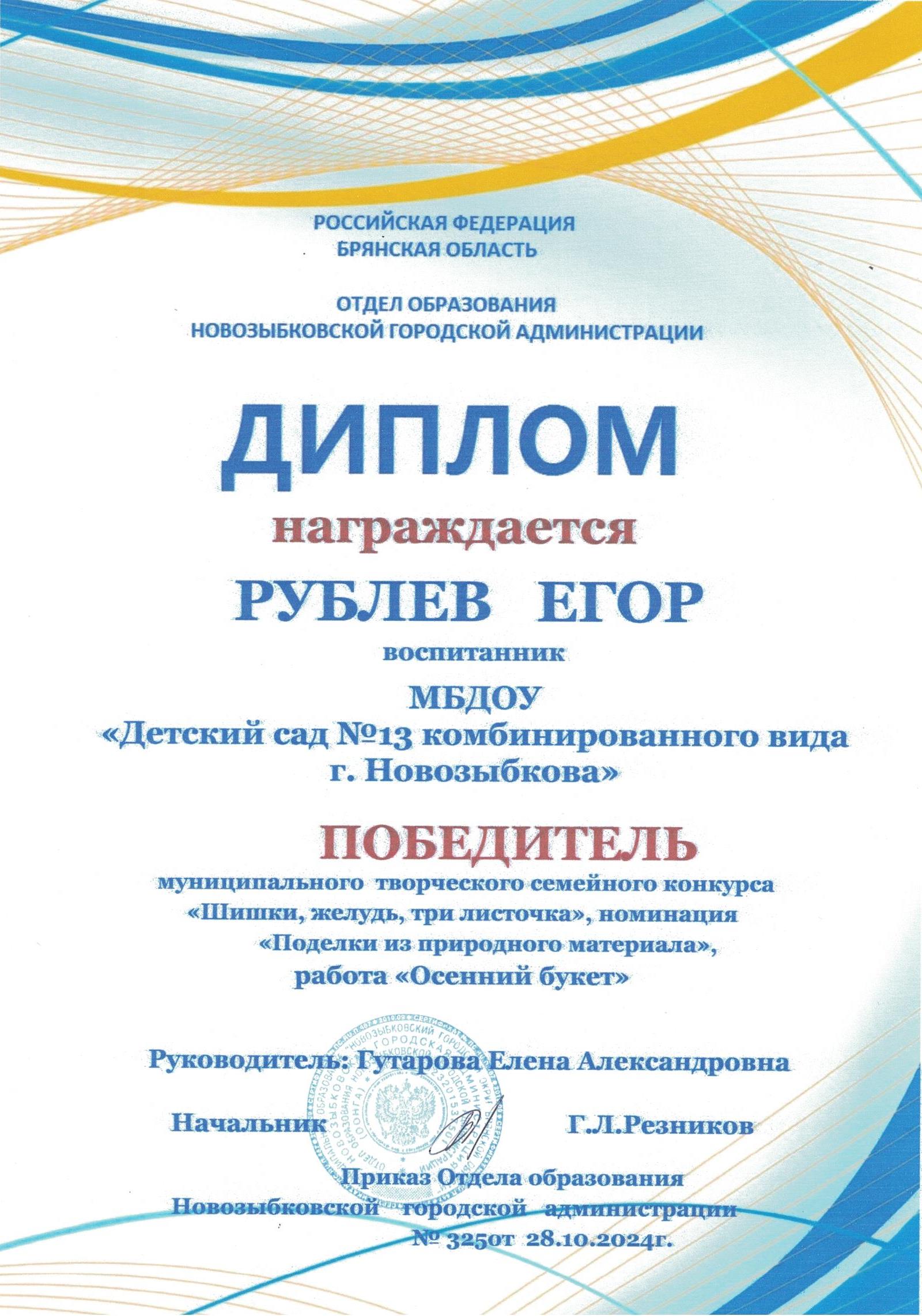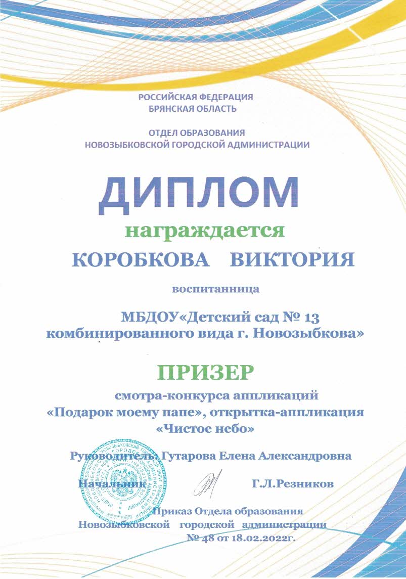 ФИО: Гутарова Елена Александровна Место работы: Муниципальное бюджетное дошкольное образовательное учреждение «Детский сад №13 комбинированного вида» г. Новозыбкова Должность: воспитатель Категория: высшая Общий трудовой и педагогический стаж: 21 год Образование: высшее Название, год окончания учреждения профессионального образования: Брянский государственный университет имени академика И. Г. Петровского, филиал Брянского государственного университета имени академика И. Г. Петровского в г. Новозыбкове, 2003 год Факультет: физико – математический Специальность, квалификация по диплому: математика, учитель математики и физики Диплом о профессиональной переподготовке: дошкольное образование 13.04.2018 год Курсы повышения квалификации: 08.02.2024 – 21.02.2024 Государственное автономное учреждение дополнительного профессионального образования Брянской области «Региональный учебный центр» по программе: «Реализация федеральной образовательной программы дошкольного образования в соответствии с ФГОС ДО».