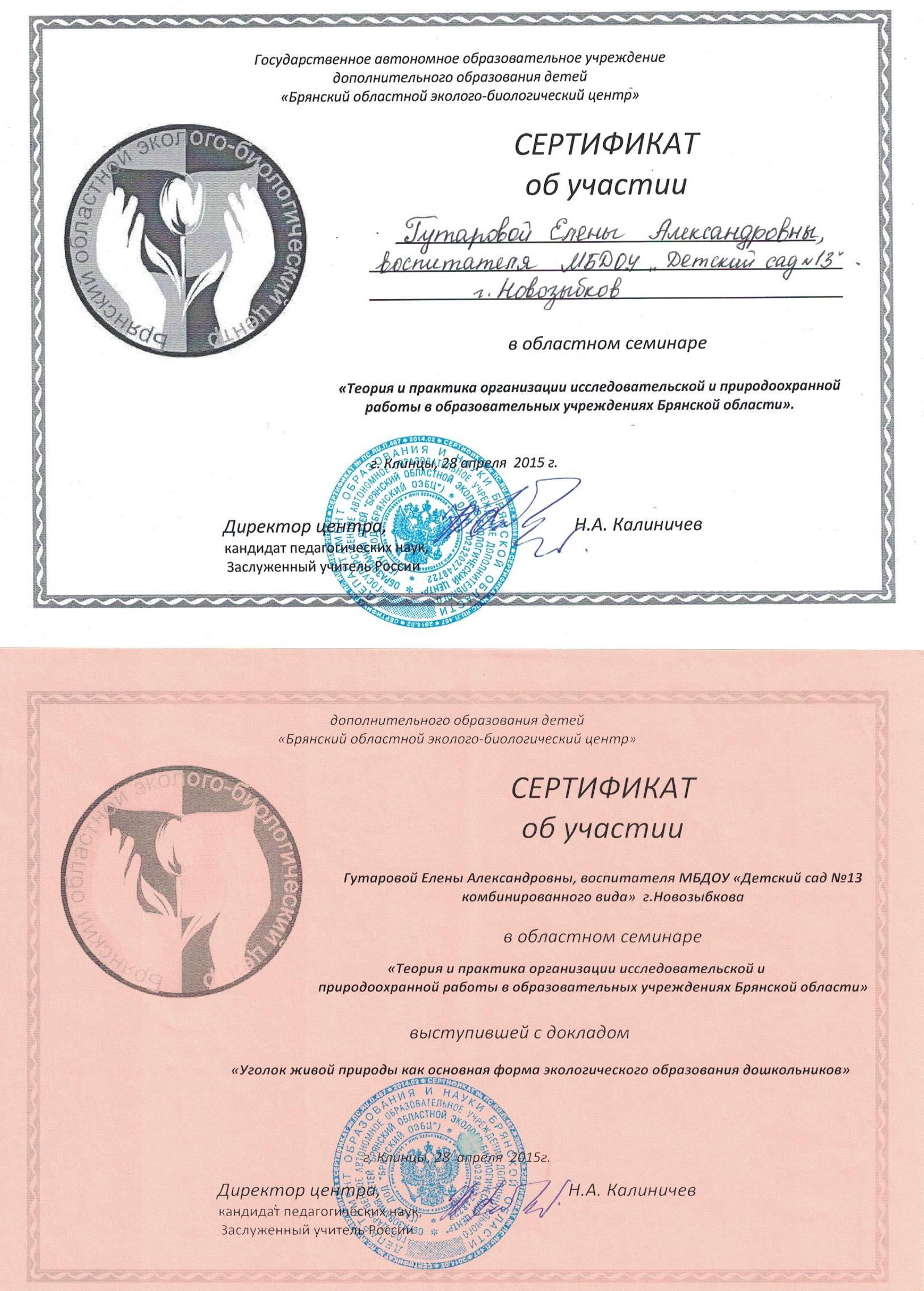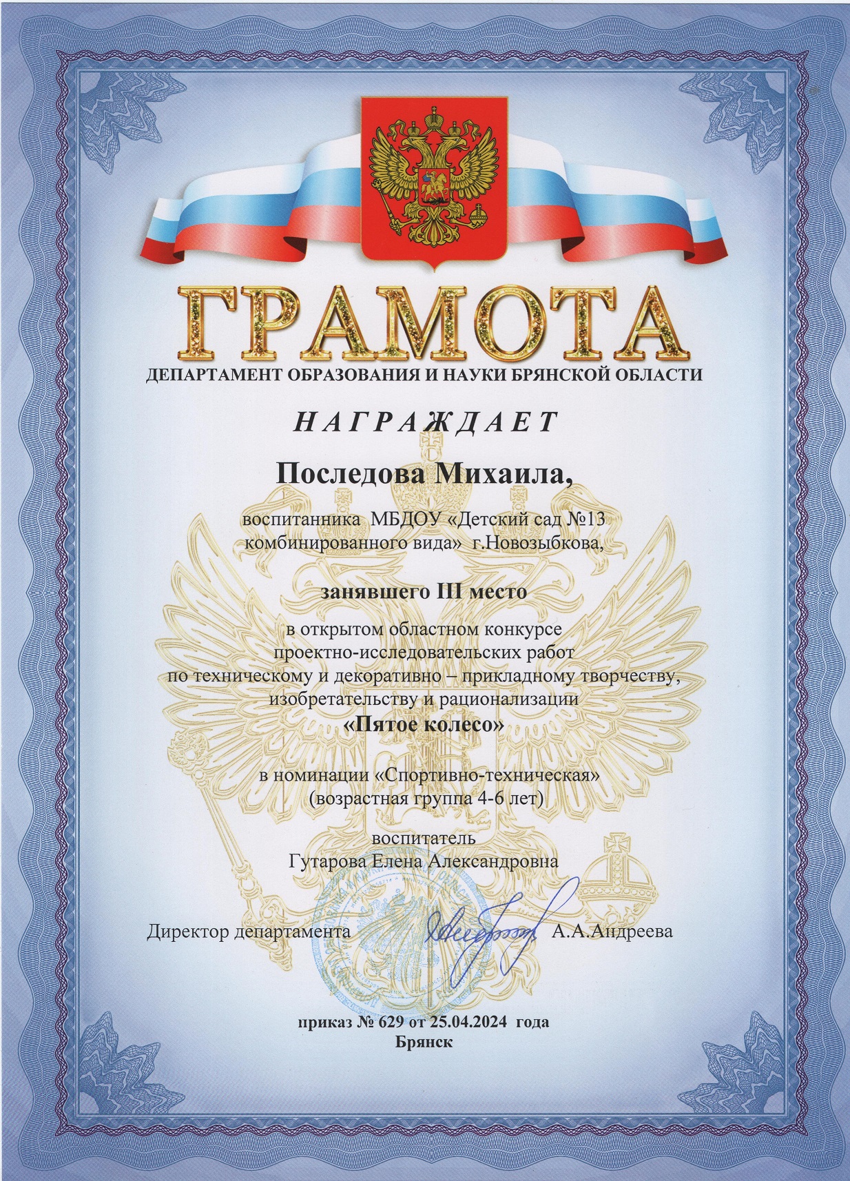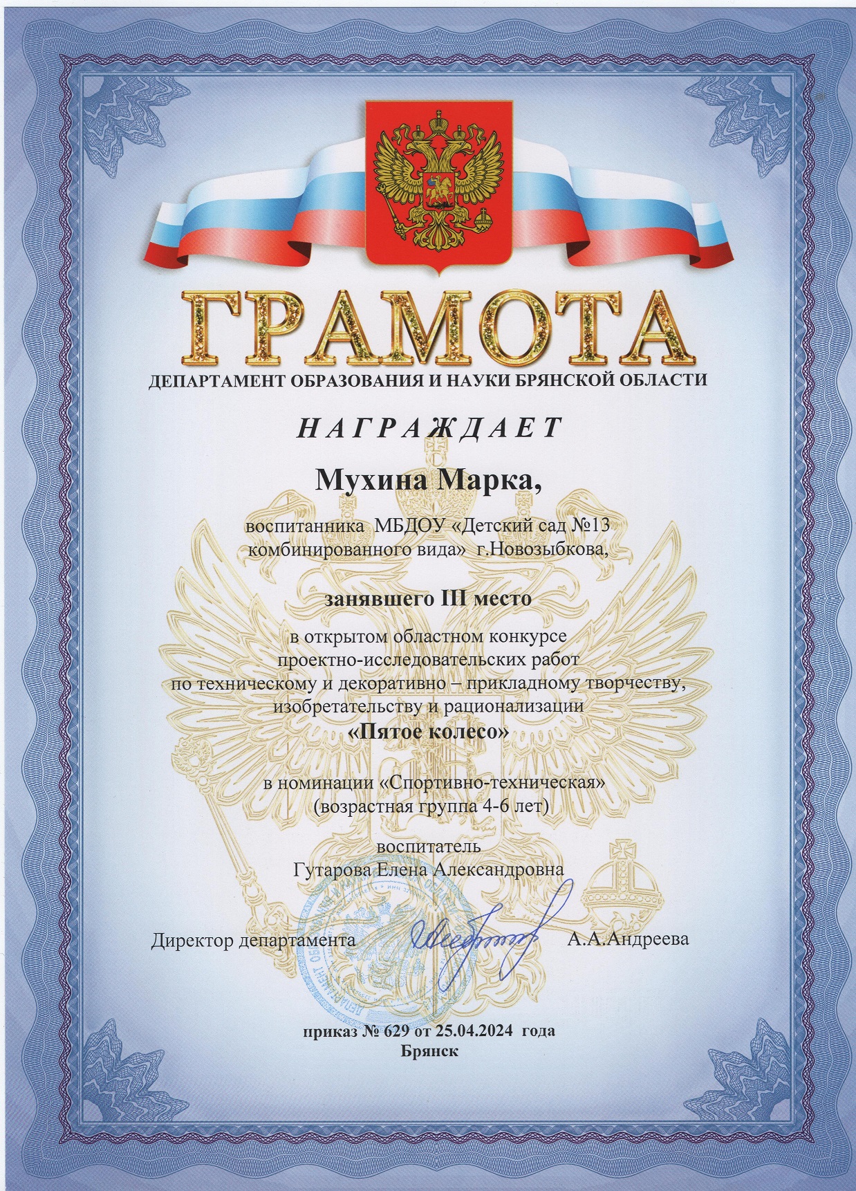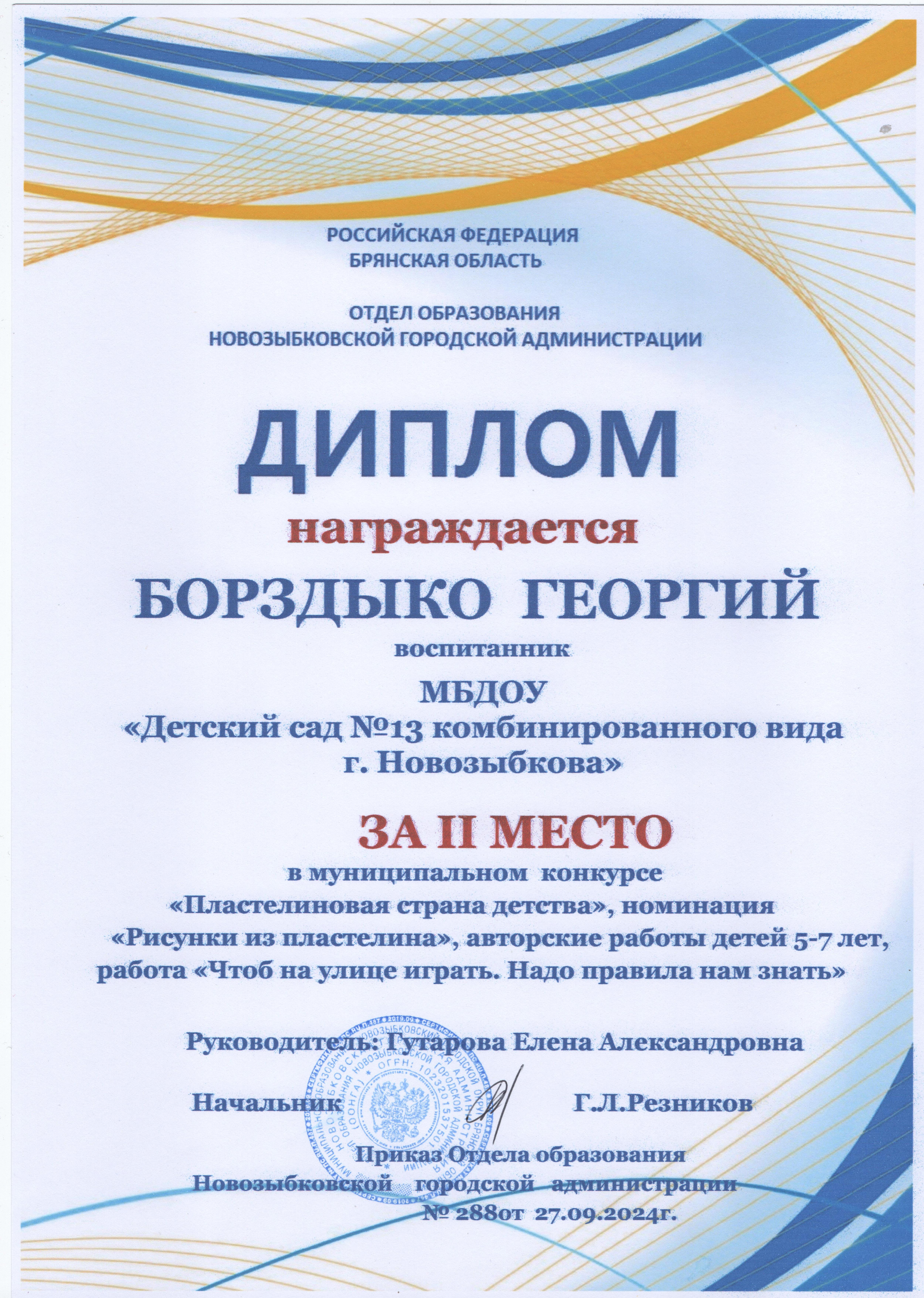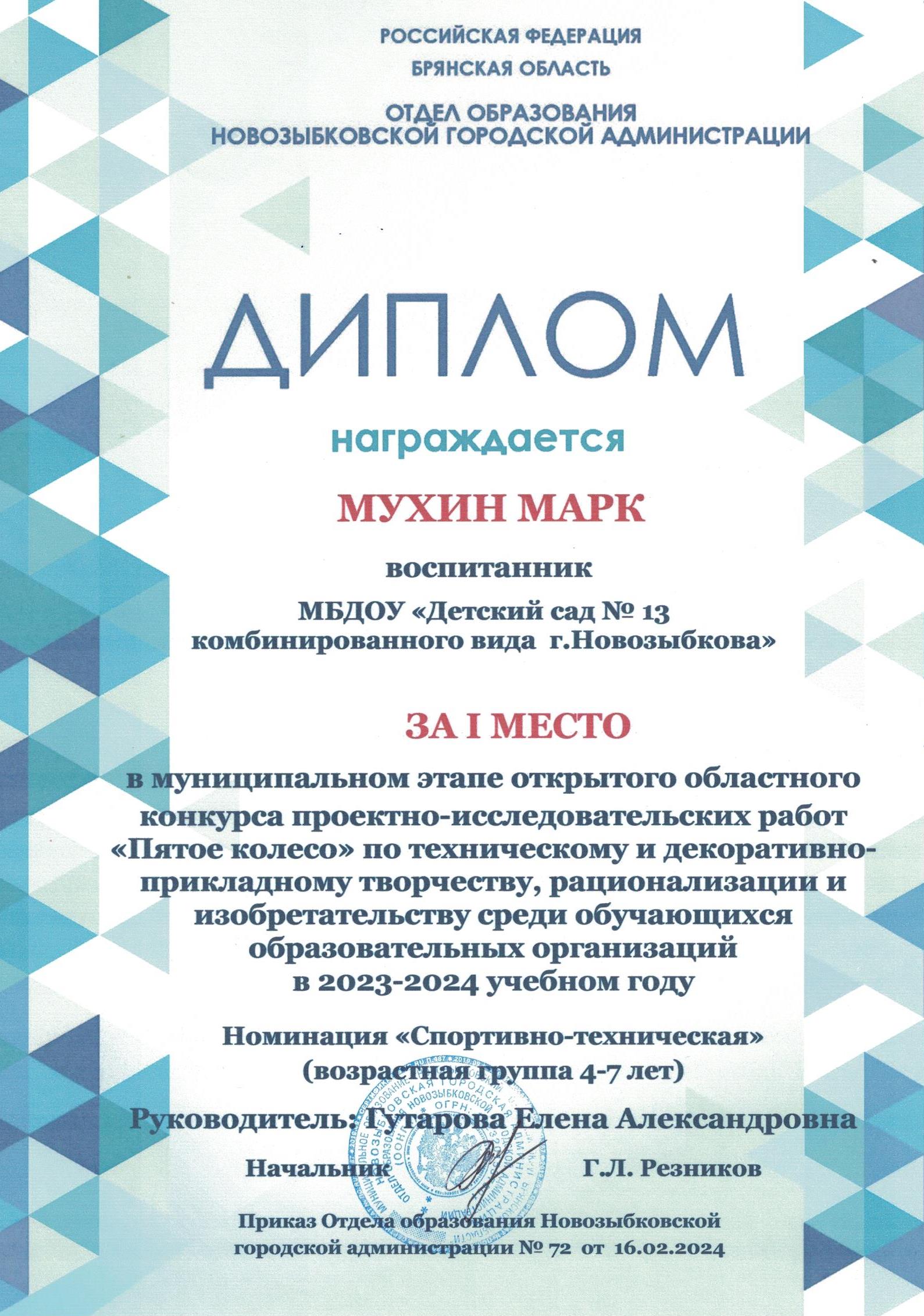 ФИО: Гутарова Елена Александровна Место работы: Муниципальное бюджетное дошкольное образовательное учреждение «Детский сад №13 комбинированного вида» г. Новозыбкова Должность: воспитатель Категория: высшая Общий трудовой и педагогический стаж: 21 год Образование: высшее Название, год окончания учреждения профессионального образования: Брянский государственный университет имени академика И. Г. Петровского, филиал Брянского государственного университета имени академика И. Г. Петровского в г. Новозыбкове, 2003 год Факультет: физико – математический Специальность, квалификация по диплому: математика, учитель математики и физики Диплом о профессиональной переподготовке: дошкольное образование 13.04.2018 год Курсы повышения квалификации: 08.02.2024 – 21.02.2024 Государственное автономное учреждение дополнительного профессионального образования Брянской области «Региональный учебный центр» по программе: «Реализация федеральной образовательной программы дошкольного образования в соответствии с ФГОС ДО».